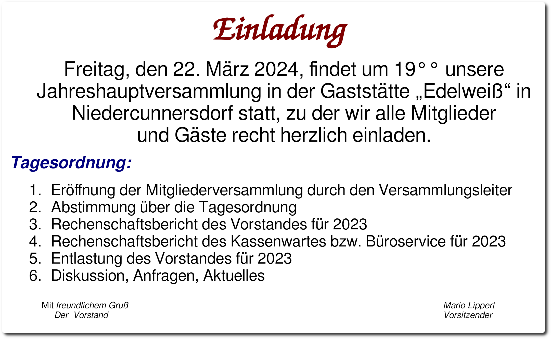 in der Jahreshauptversammlung wurde für 2024 ein Mitgliedsbeitrag von 48,- für 2024 einstimmig beschlossen.