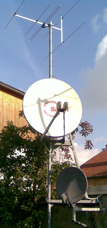 Antennenmast mit UKW (Löbau) Antenne und 2 Satellitenantennen.